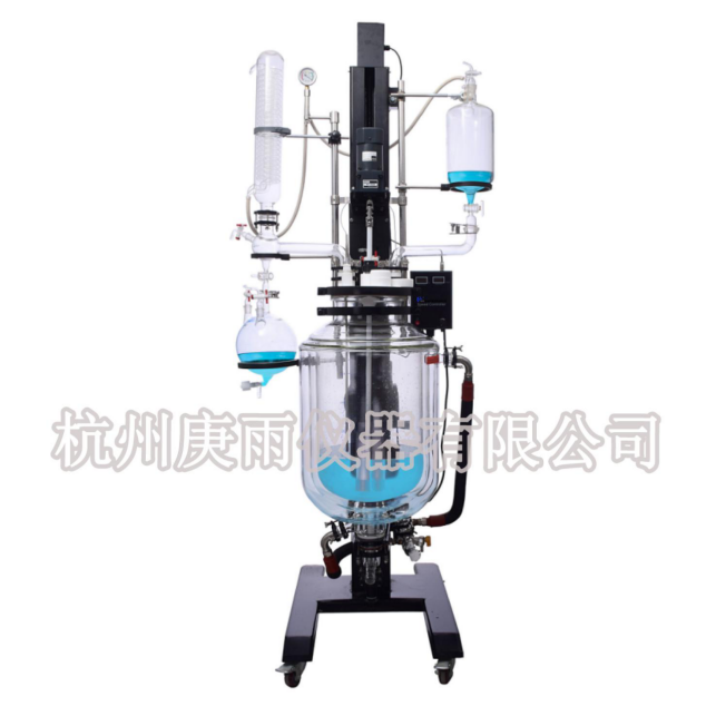 在攪拌物料的同時,通過內(nèi)夾層注入循環(huán)的熱溶液或冷卻液,對釜內(nèi)的物料進行恒溫的加熱或制冷。物料進行加熱反應時,在真空條件下可以提高蒸發(fā)效率(需連接真空裝置),溶媒蒸汽經(jīng)玻璃冷凝盤管時冷卻成液體(需連接冷卻裝置),可回流到釜內(nèi),也可通過回流彎頭下部閥門進行回收。反應完畢,物料可從釜底的側(cè)出料口放出。