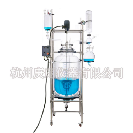本機具有電動恒速攪拌系統(tǒng)、冷凝、滴加系統(tǒng),釜體夾層需外接加熱或制冷的循環(huán)設(shè)備。在攪拌物料的同時,通過夾層注入循環(huán)的熱溶液或冷卻液,對釜內(nèi)的物料進行恒溫的加熱或制冷。物料進行加熱反應(yīng)時,在真空條件下可以提高蒸發(fā)效率(需連接真空裝置),溶媒蒸汽經(jīng)玻璃冷凝盤管時冷卻成液體(需連接冷卻裝置),可回流到釜內(nèi),也可通過回流彎頭下部閥門進行回收。反應(yīng)完畢,物料可從釜底的側(cè)出料口放出。