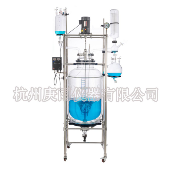 本機(jī)具有電動(dòng)恒速攪拌系統(tǒng)、冷凝、滴加系統(tǒng),釜體夾層需外接加熱或制冷的循環(huán)設(shè)備。在攪拌物料的同時(shí),通過夾層注入循環(huán)的熱溶液或冷卻液,對釜內(nèi)的物料進(jìn)行恒溫的加熱或制冷。物料進(jìn)行加熱反應(yīng)時(shí),在真空條件下可以提高蒸發(fā)效率(需連接真空裝置),溶媒蒸汽經(jīng)玻璃冷凝盤管時(shí)冷卻成液體(需連接冷卻裝置),可回流到釜內(nèi),也可通過回流彎頭下部閥門進(jìn)行回收。反應(yīng)完畢,物料可從釜底的側(cè)出料口放出。