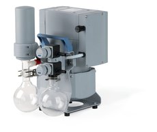 該化學(xué)真空系統(tǒng)使用一個(gè)真空泵即可同時(shí)實(shí)現(xiàn)兩種過(guò)程控制。可與旋轉(zhuǎn)蒸發(fā)儀、真空濃縮儀和真空烘箱等配合使用。每個(gè)真空連接口配備一個(gè)手動(dòng)控制閥來(lái)調(diào)節(jié)進(jìn)氣口的有效流量。MD 4C NT泵的具有非常大的抽氣速度,足以同時(shí)應(yīng)對(duì)兩個(gè)復(fù)雜的真空系統(tǒng)。進(jìn)氣口的分離瓶(AK)為玻璃材質(zhì),外部覆保護(hù)膜,用來(lái)防止顆?;蛐∫旱芜M(jìn)入泵體。出氣口的廢氣冷凝器(EK)效率高,結(jié)構(gòu)緊湊,可實(shí)現(xiàn)近100%的溶劑回收效果,有效地循環(huán)利用溶劑同時(shí)保護(hù)環(huán)境。