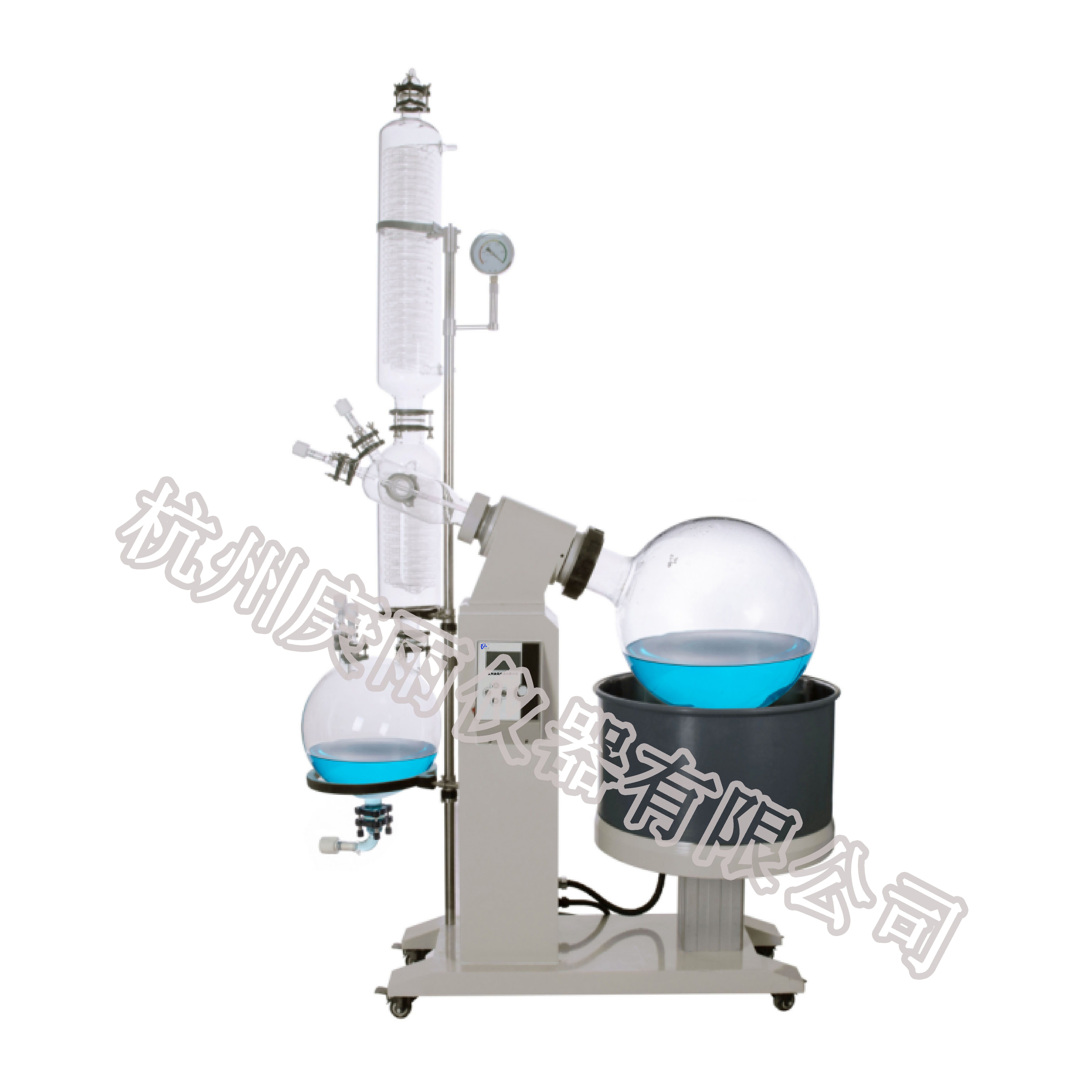 蒸發(fā)瓶恒速旋轉(zhuǎn),水浴鍋恒溫加熱,在此條件下:物料在蒸發(fā)瓶內(nèi)壁形成大面積均勻薄膜,在真空條件下可以提高蒸發(fā)效率(需連接真空裝置),溶媒蒸汽經(jīng)玻璃冷凝盤管時(shí)冷卻成液體(需連接冷卻裝置),回收于收集瓶。