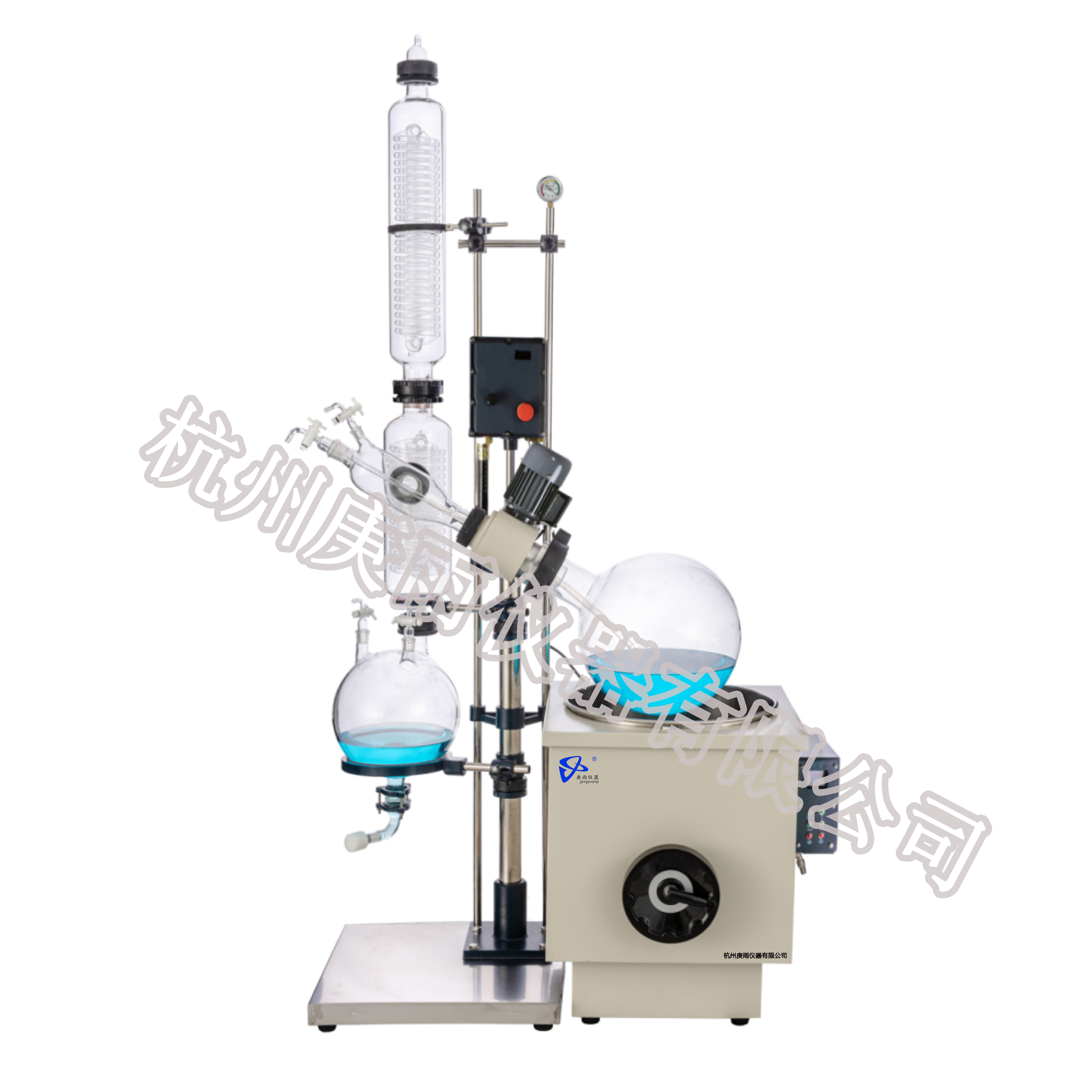 蒸發(fā)瓶恒速旋轉(zhuǎn),水浴鍋恒溫加熱,在此條件下:物料在蒸發(fā)瓶內(nèi)壁形成大面積均勻薄膜,在真空條件下可以提高蒸發(fā)效率(需連接真空裝置),溶媒蒸汽經(jīng)玻璃冷凝盤管時冷卻成液體(需連接冷卻裝置),回收于收集瓶。