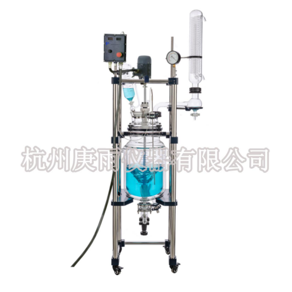 本機具有電動恒速攪拌系統(tǒng)、冷凝、滴加系統(tǒng),釜體夾層需外接加熱或制冷的循環(huán)設(shè)備。在攪拌物料的同時,通過夾層注入循環(huán)的熱溶液或冷卻液,對釜內(nèi)的物料進行恒溫的加熱或制冷。物料進行加熱反應(yīng)時,在真空條件下可以提高蒸發(fā)效率(需連接真空裝置),溶媒蒸汽經(jīng)玻璃冷凝盤管時冷卻成液體(需連接冷卻裝置),可回流到釜內(nèi),也可通過回流彎頭下部閥門進行回收。反應(yīng)完畢,物料可從釜底的側(cè)出料口放出。
