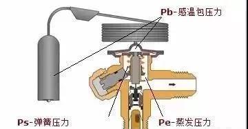 當感溫包壓力上升,導致 Pb > Ps+Pe 時,膜片向下移動,閥門打開,更多制冷劑流入蒸發(fā)器。