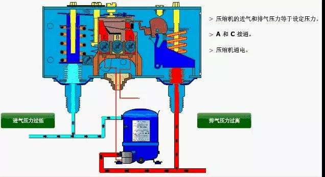 壓力控制器能防止進氣壓力(蒸發(fā)器壓力)過低或排氣壓力(冷 凝器壓力)過高,以此控制和保護系統(tǒng)。