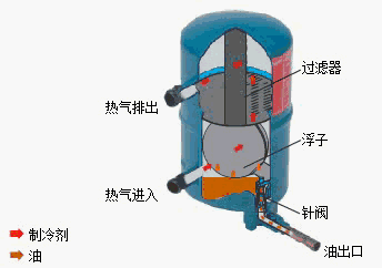 4、油位升高時,浮子打開一個針閥,讓油回到壓縮機集油槽。