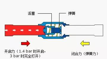 在內部彈簧力作用下,閥門在壓差達到 1.4 bar 時開始打開,達 到 3 bar 時完全打開。閥門的壓差越大,其開合度也越大。