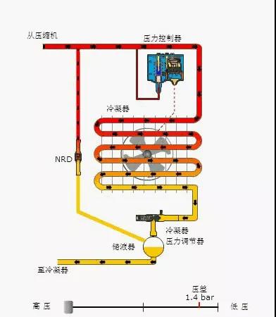 冷凝器壓力控制系統(tǒng)由一個壓力調節(jié)器和一個壓差閥組成。