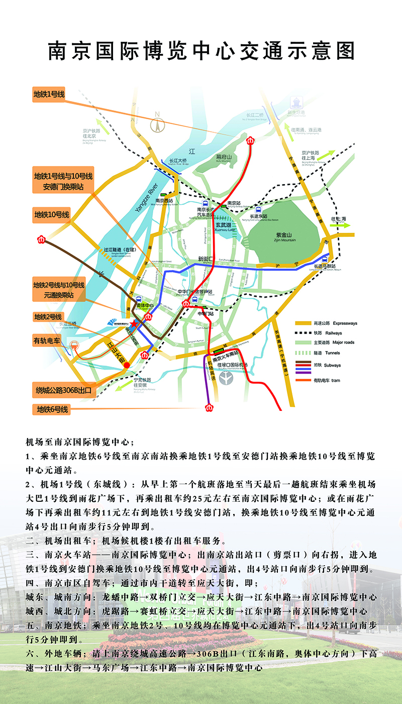 交通方式:南京火車(chē)站(南站)→南京站1號(hào)線 →到安德門(mén)站換乘10號(hào)線→元通站 4號(hào)口出 步行約5分鐘到達(dá)南京博覽中心
